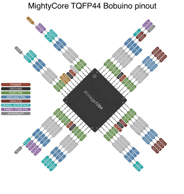 Bootloader pre ATmega1284p som použil MightyCore, ktorý používa 3 typy výstupov IO a to buď STANDARD, Sanguino alebo BOBUINO, ja som v mojom zapojení použil BOBUINO PIN OUT a s 16mhz hodinami, ale je možné použiť aj 8, 12, 18.432, 20.